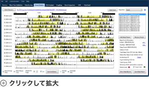 左のデータは被験者が日本から米国に行ってまた日本に帰ってきたデータです。このダブルプロット方式によるデータを見ると日本にいる間は夜12時から朝6時まで睡眠をしているのでアクティビティが少なく白くなっていますが、アメリカにいる間はそれがずれています。日本に帰ってくるとまた以前と同じ時間帯に睡眠がもとに戻るのが分かりますが、これがアクチスリープBTモニターによるサーカディアンリズムの計測です。