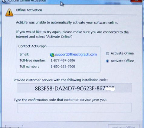インターネットセキュリティーが強い施設では、インターネット経由のアクティベーションができない時があります。その際にはOffline Activationの画面右側にある、Activate Offlineをクリックすると24ケタのオフラインコードが表示されますので、その画面をキャプチャーするか番号を弊社まで連絡ください。1,2営業日でオフライン用のConfirmation Codeを送付しますので、それを入力するとソフトが使用できるようになります。