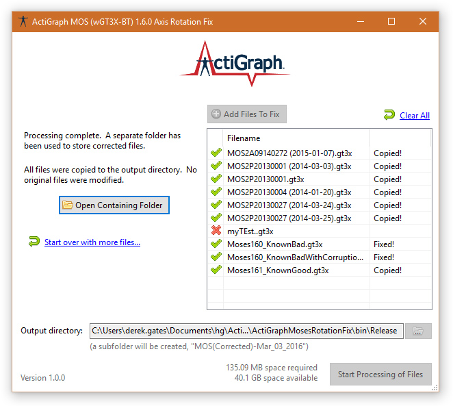 add files to fix をクリックしてデータを表示させると、問題のないファイルは緑色のチェック✔が表示されます。問題のあるデータは赤い×印が表示されますので、右下のStart Processing Fileをクリックしてデータを変換してください。